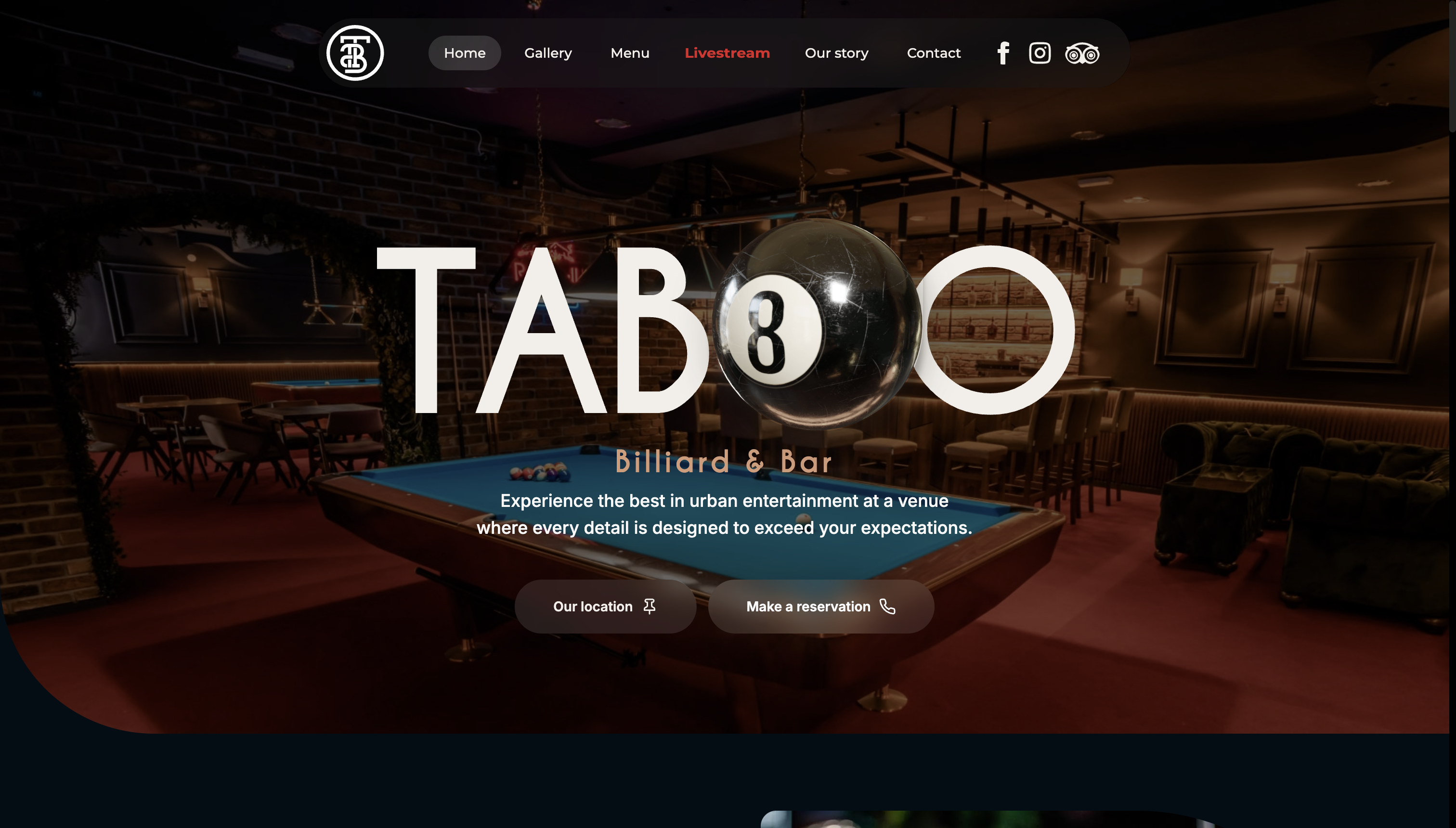 Livestream scores wired into the billiard software. Live match updates. A YouTube stream. A QR menu. A gallery built with GSAP and Framer Motion that does not look like every bar site.